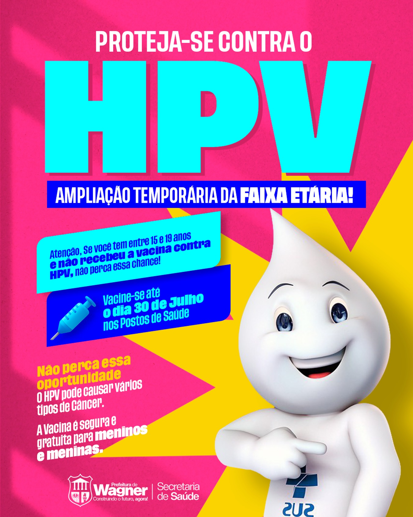 A faixa etária para vacinação contra o HPV foi ampliada temporariamente. Se você ainda não tomou sua dose, aproveite essa oportunidade e vacine-se até o dia 30 de julho nos postos de saúde.
